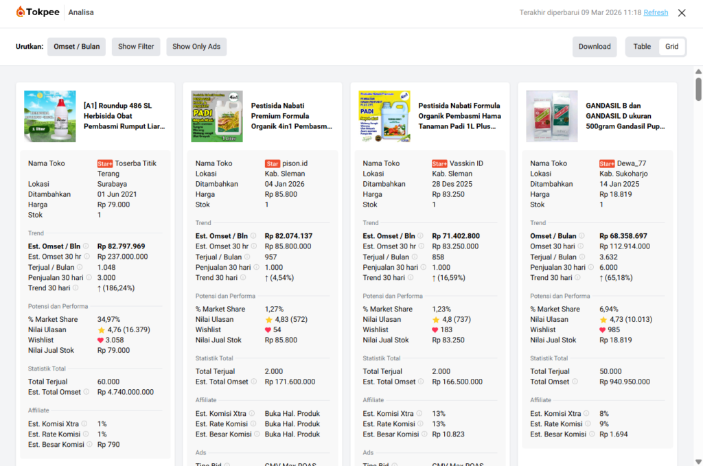 - Riset Pencarian dan Kategori membantu menemukan produk yang ramai dicari sesuai kata kunci.