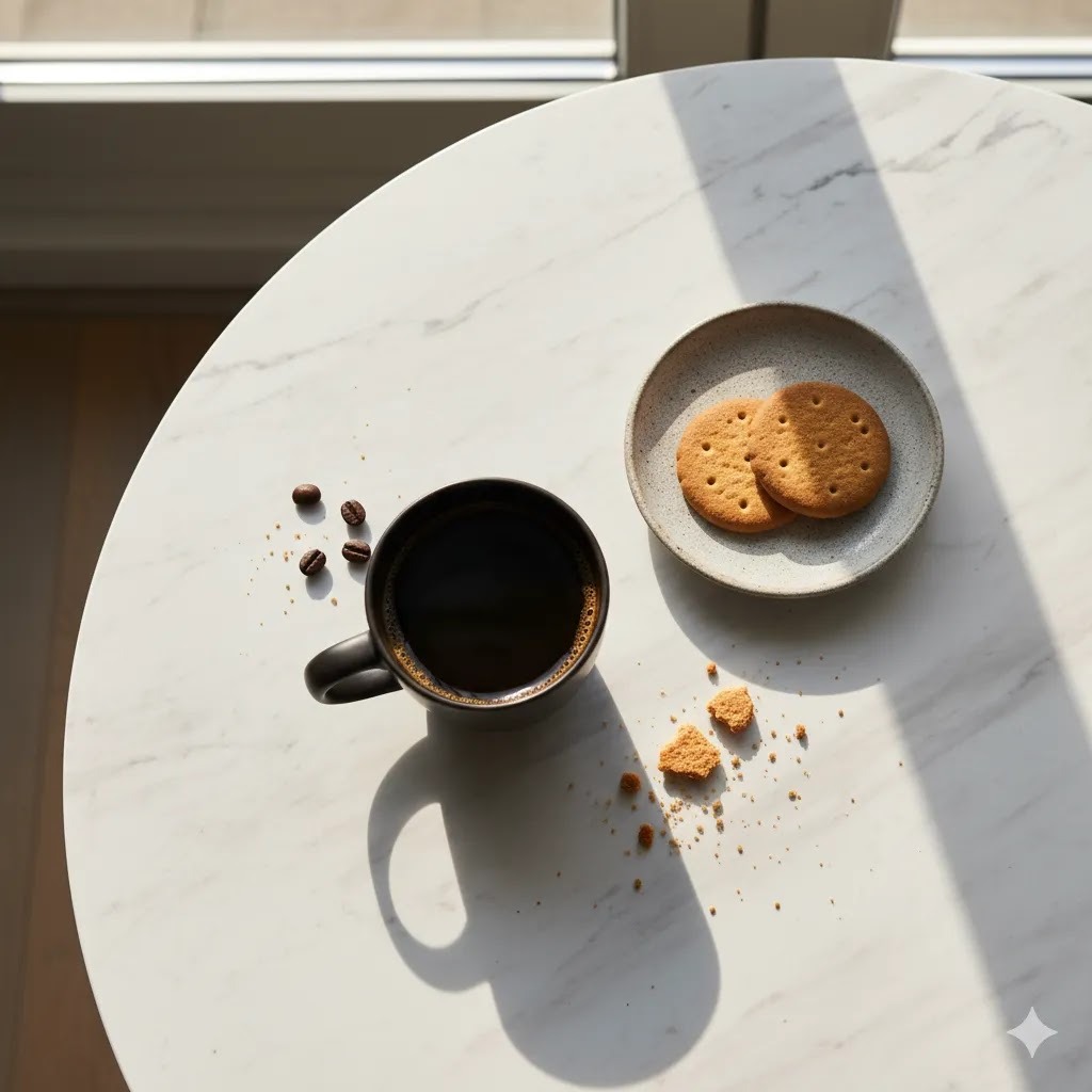 - Edit foto kopi ini. Di meja marmer putih dengan sedikit remah biskuit. Gaya Flat Lay, pencahayaan alami, high-res. (1:1)