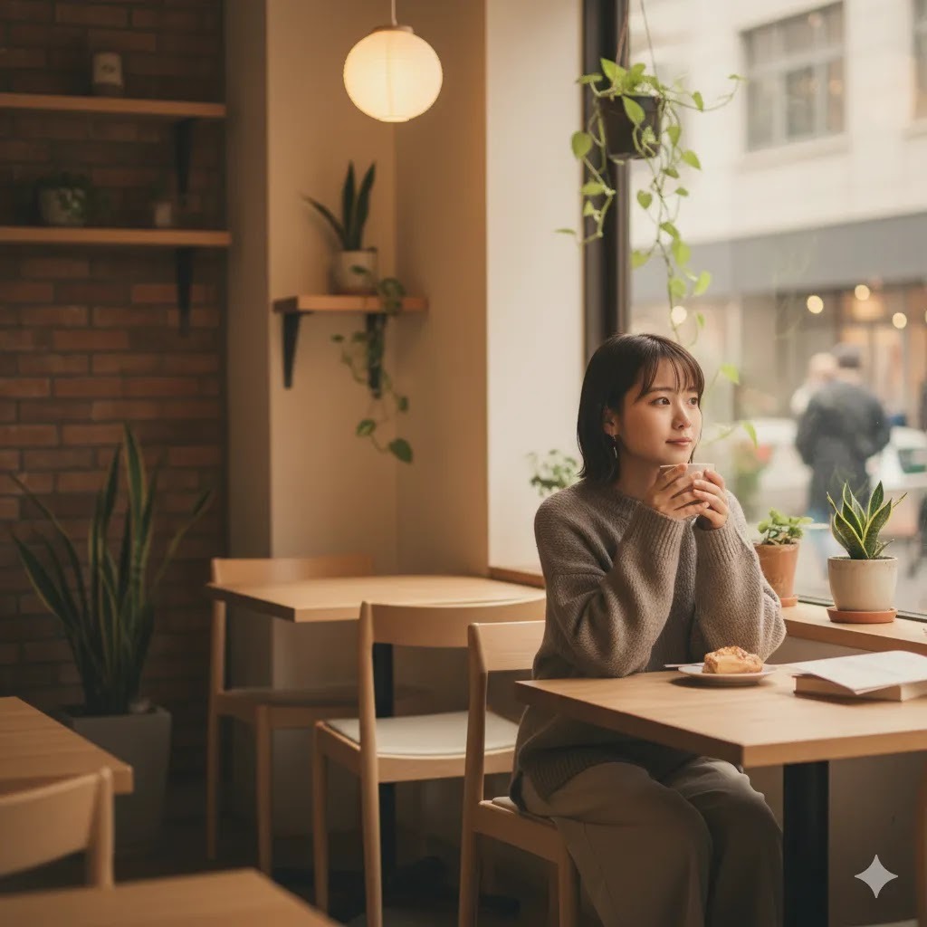 - Edit foto saya seperti lagi duduk sendiri di Japanese cafe. Suasana warm, cozy, ada tanaman hias minimalis. Cahaya lembut. (4:5)