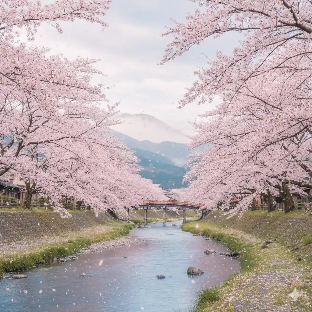 - Edit foto pemandangan ini. Tambahkan bunga sakura mekar di tepi sungai. Nuansa musim semi Jepang, warna lembut. (16:9)