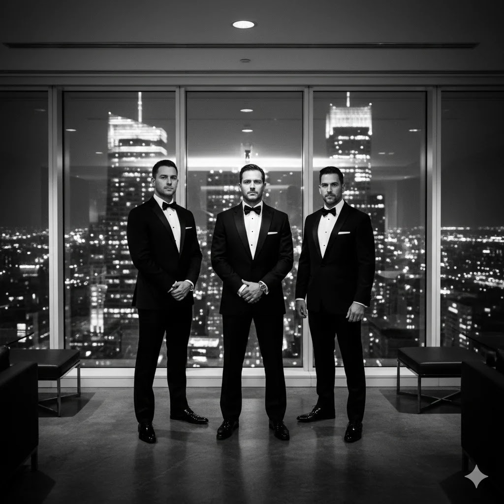 2. Buatlah foto tiga pria yang memakai jas hitam putih (tuxedo) dengan latar belakang interior gedung pencakar langit modern. Suasana profesional dan berwibawa, tone high-contrast hitam putih, ukuran foto landscape.