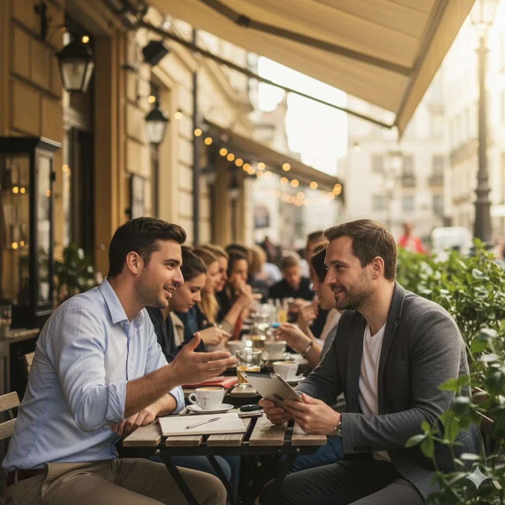10. Buatlah foto dua pria yang memakai pakaian bisnis kasual sambil berdiskusi di teras kafe yang ramai. Suasana kolaboratif dan dinamis, tone natural light, ukuran foto portrait.
