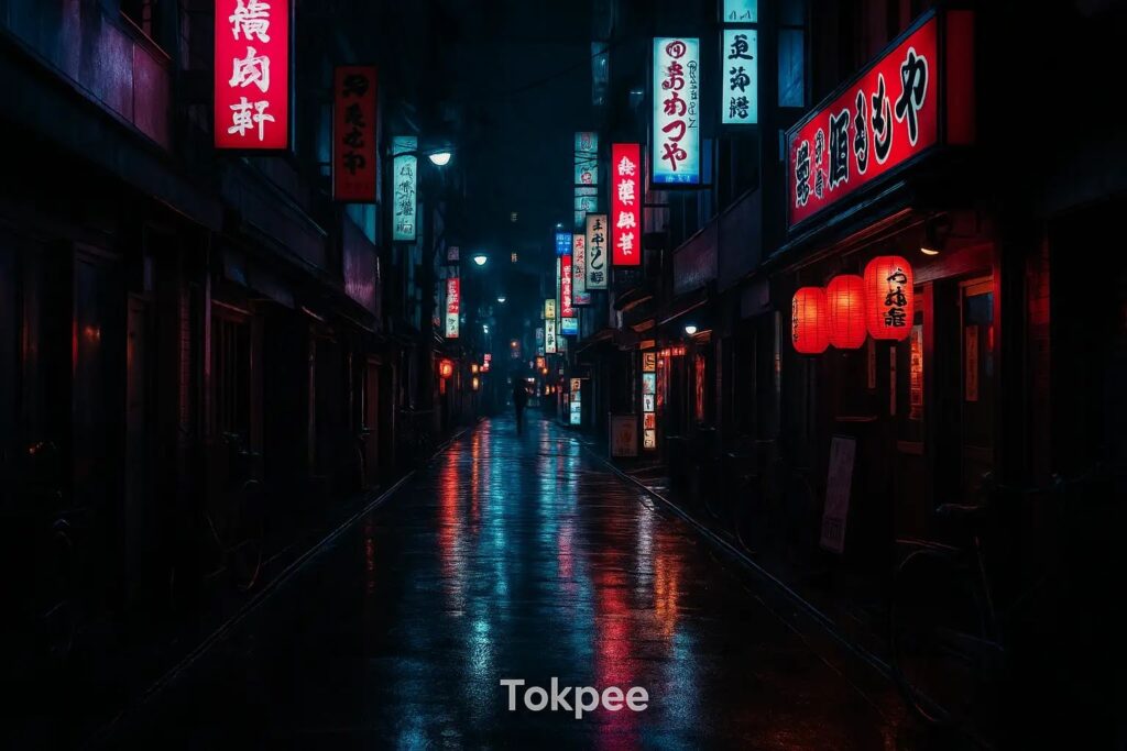8. “Japanese street at night with neon signs, rain reflections, and moody atmosphere.”