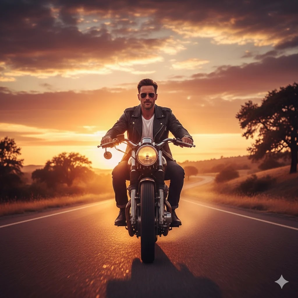 - Buatlah foto satu pria dengan jaket kulit hitam dan kacamata aviator sedang mengendarai motor vintage di jalanan sepi saat golden hour. Gaya rebel dan maskulin, tone sinematik sunset, ukuran foto landscape.