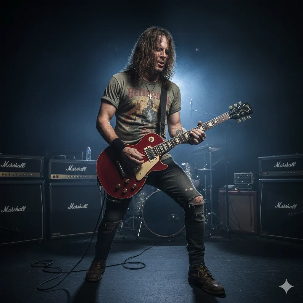 - Buatlah foto satu pria dengan kaus vintage dan rambut gondrong sedang memainkan gitar listrik di studio musik. Gaya rockstar edgy, tone dark stage lighting, ukuran foto landscape.