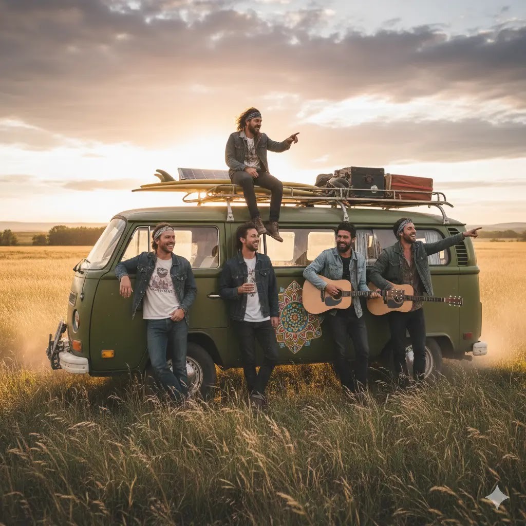 - Buatlah foto lima pria dengan gaya kasual sedang berpose santai di depan van yang dimodifikasi di tengah padang rumput. Suasana kebersamaan dan kebebasan, tone indie travel vibe, ukuran foto landscape.