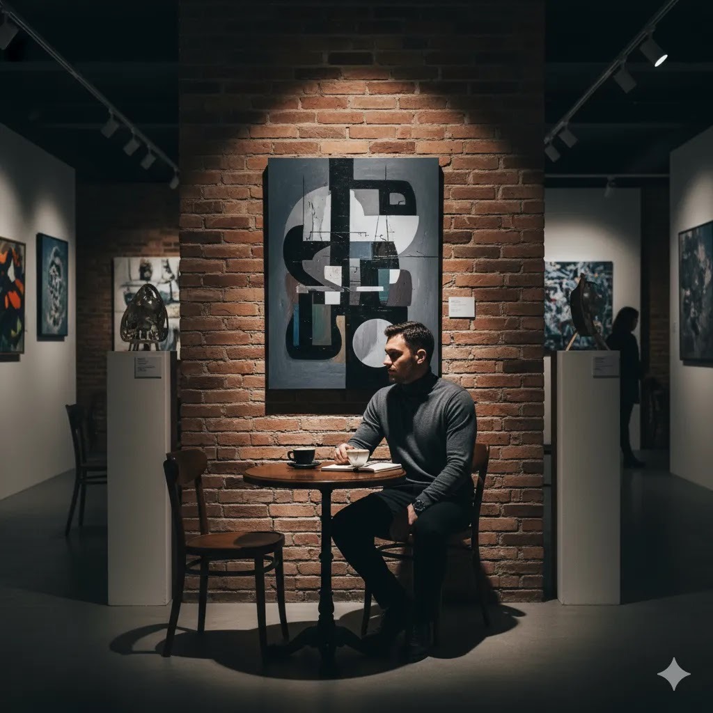 12. “Edit foto saya seolah di kafe seni dengan lukisan abstrak di dinding dan patung mini. Suasana inspiratif, soft lighting. Tema: Art Gallery Cafe, 4:5.”