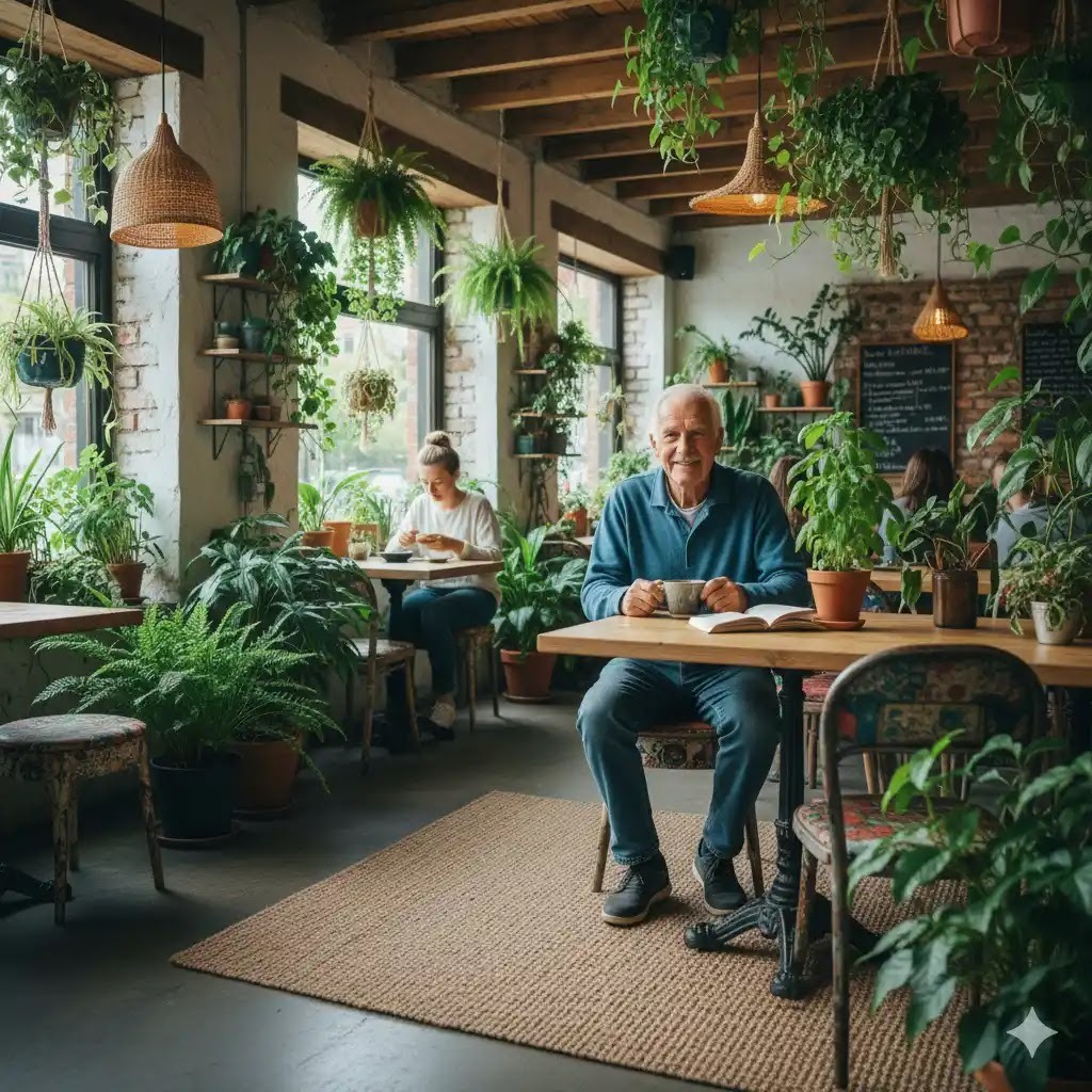 8. “Edit foto saya seperti duduk di kafe dengan indoor garden, penuh bunga dan dedaunan. Suasana segar, cerah, natural light. Tema: Garden Cafe, 2:3.”