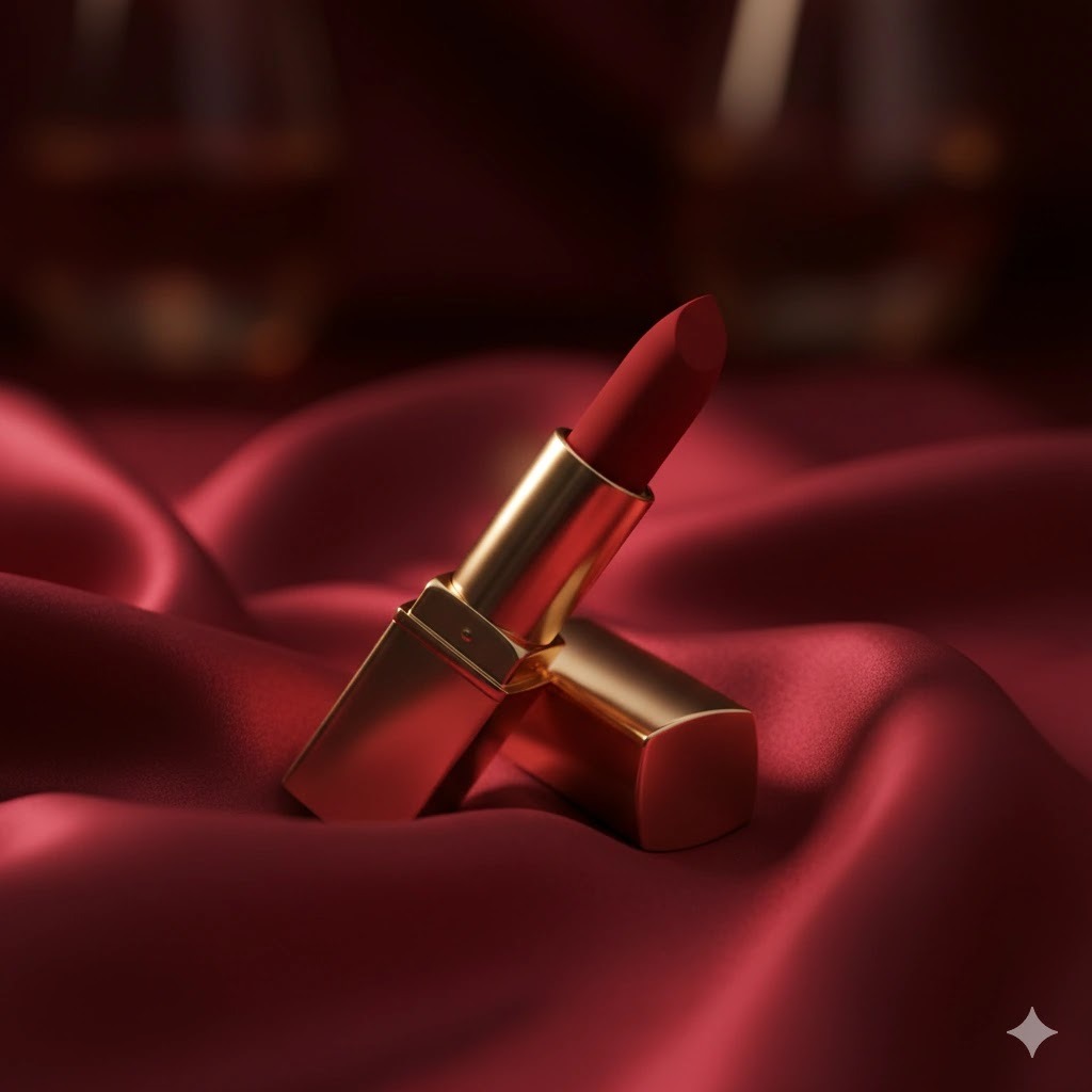 1. Buatkan foto produk lipstik matte merah yang diletakkan di atas kain sutra merah tua dengan pantulan cahaya lembut. Suasana mewah dan sensual, tone deep cinematic, ukuran foto square.