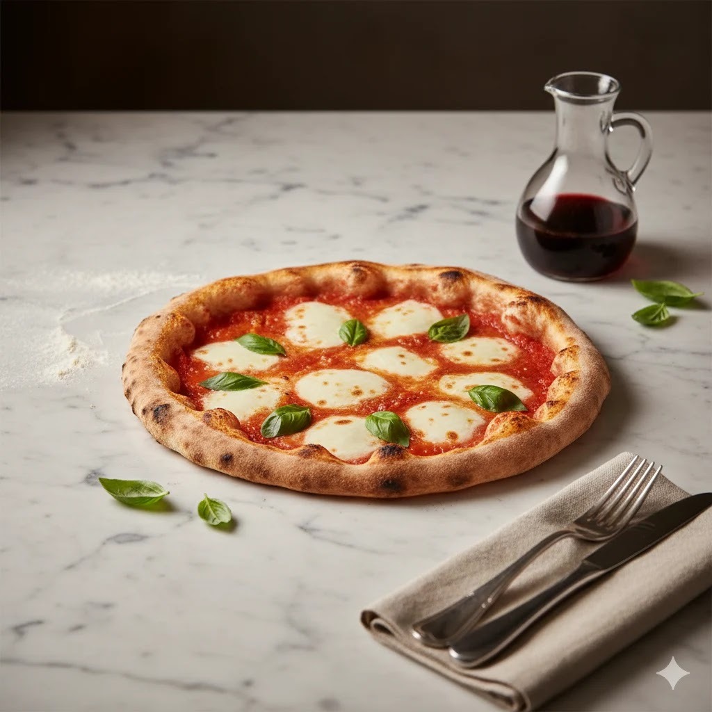 9. Buatkan foto produk pizza tipis Neapolitan yang disajikan di meja marmer dengan alat makan perak. Suasana otentik dan berkelas, tone vibrant Italian, ukuran foto landscape.